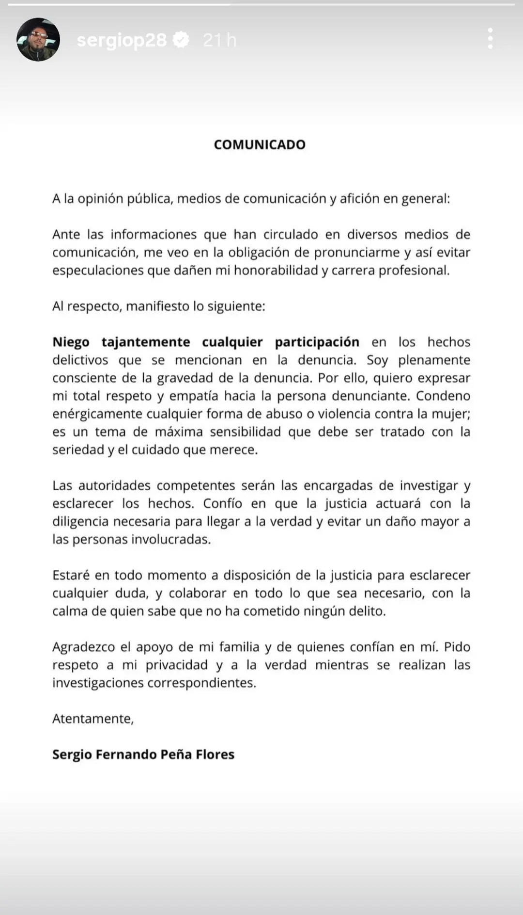 Peña assured that he faces the process with the “calm of someone who knows that he has not committed any crime” and requested respect for his privacy while the investigations continue their official course.